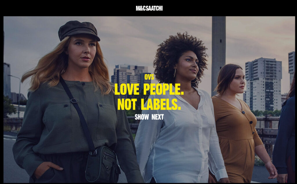 Ad esempio, la campagna di M&C Saatchi (agenzia oggetto dell’inchiesta) realizzata per OVS è proposta con lo slogan LOVE PEOPLE. NOT LABELS.